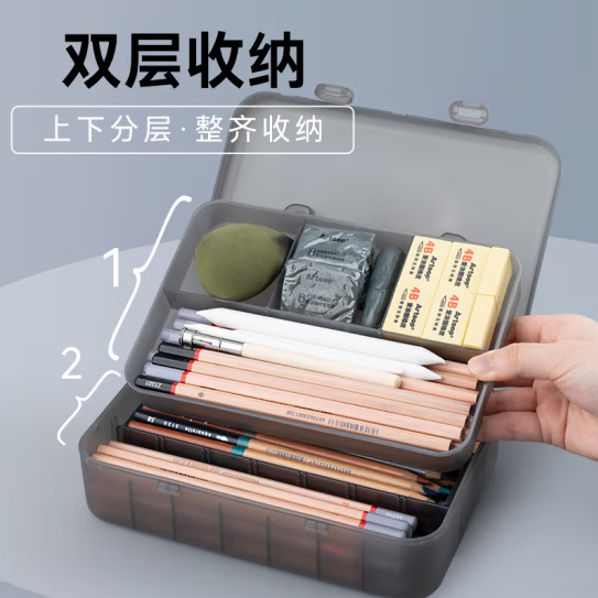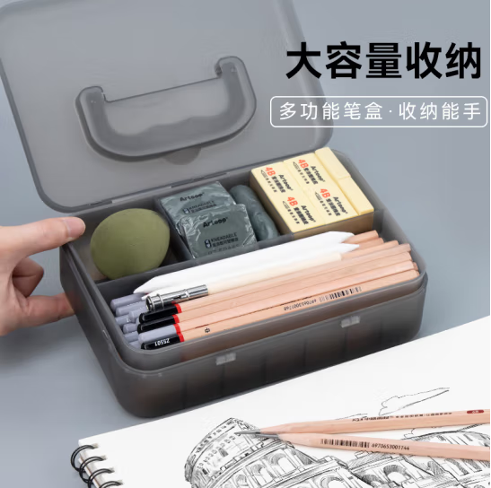 磨砂收纳盒多功能笔盒手提美术铅笔盒文具盒双层素描专用大容量收纳盒绘画 磨砂黑双层储物盒